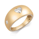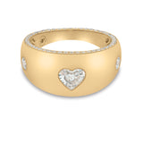 Crafted in 14K Yellow Gold, this iconic dome-shaped ring centres on a striking Heart-Shaped Lab-Grown Diamond, accented by two Round Lab-Grown Diamonds and a row of smaller diamonds along the top and bottom edges. The ring weighs 7.30 grams and has a total carat weight of 1.00.